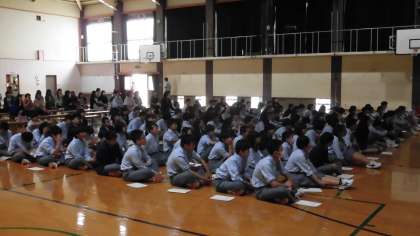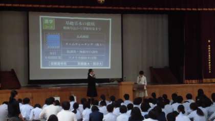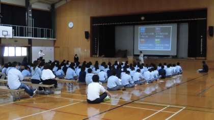 体育館で「進路講話」です。