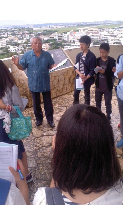 また、普天間基地を見下ろす展望台で当時の戦争体験を聞いています。
