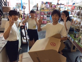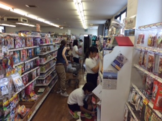 ダイワペット、4人でペットに囲まれ、品出しをしていました。