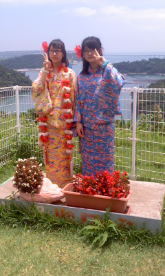 びんがた衣装で記念撮影。バックは古宇利大橋