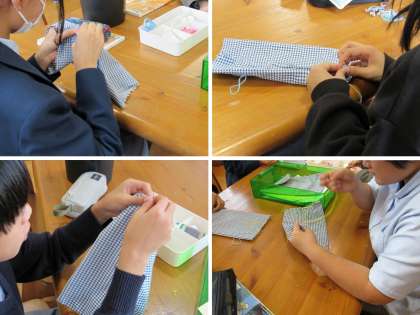 1年4組の家庭科の授業では、手縫いでティッシュケースづくりをしました。
