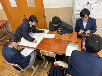 京都市内の高校5校から班ごとに選んだ1校を訪ねて見学などを行い、その結果をKHの時間にまとめて、壁新聞を作りました。