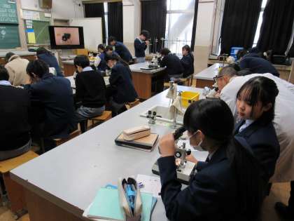 1年2組の理科の授業では、火山灰に含まれる鉱物を双眼実体顕微鏡を使って観察しました。
