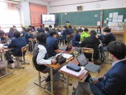 2年3組の英語科の授業では、「コップ一杯の牛乳」という物語を各班で作り変えて発表する準備をしました。