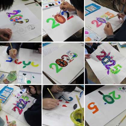 1年4組の美術科の授業では、前回に続いて、自身の今年の出来事をイメージして「2025」という文字を飾り文字にして、紙袋にデザインしました。