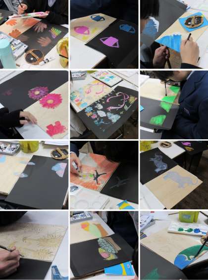 2年3組の美術科の授業では、前回に続いて、木版画の一版多色刷りで「夢の世界」を表現する作品を制作しました。