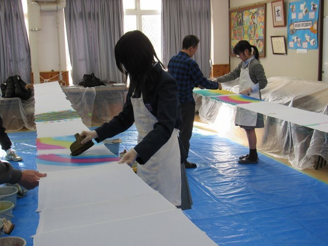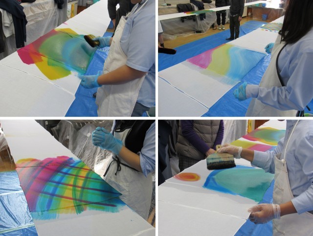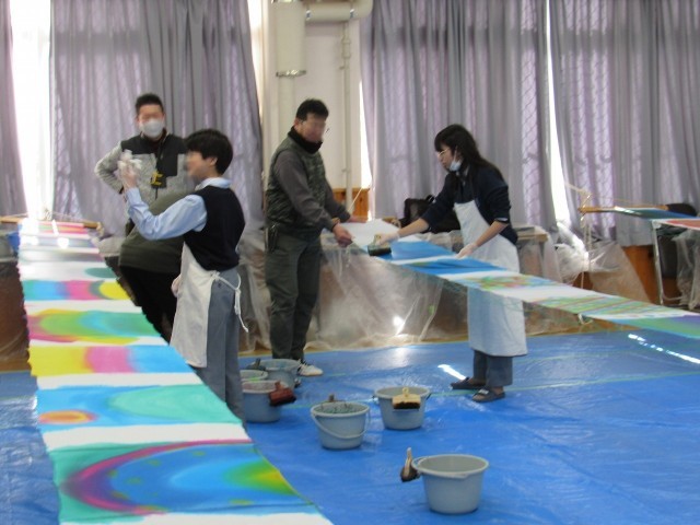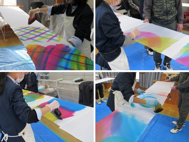 引染工業協同組合の講師の皆様にご指導を頂き、これまでの1年2組、1年3組に続いて、本日は、3・4限目に1年4組が「美術匠授業」を受け、「引染」に挑戦しました。