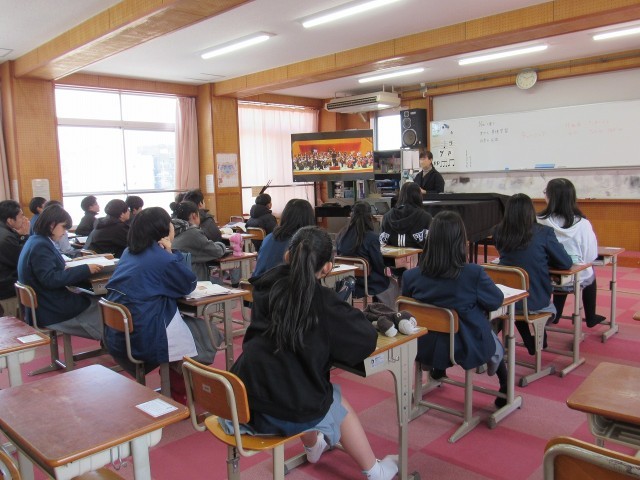 1年3組の音楽科の授業では、一昨日行われた「オーケストラ入門」の事後学習の後、日本の民謡について学びました。