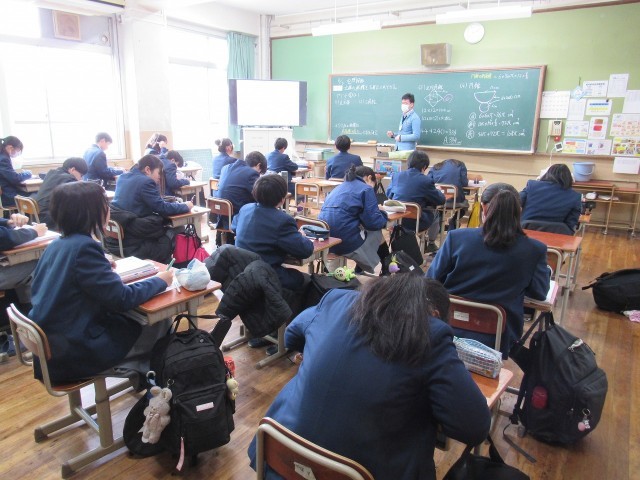 1年2組の数学科の授業では、立体の錐の体積の求め方を水を使った実験をもとに考えました。