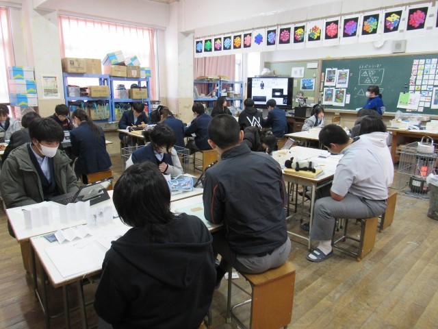 3年3組の美術科の授業では、最終単元で、松林図屏風の鑑賞をもとに「嘉楽中図屏風」というテーマで金屏風の制作に入りました。