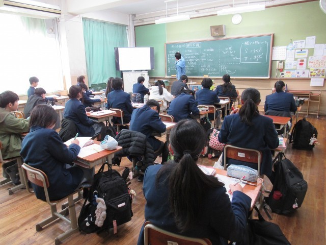 1年2組の数学科の授業では、各種立体の表面積と体積の演習問題に取り組みました。