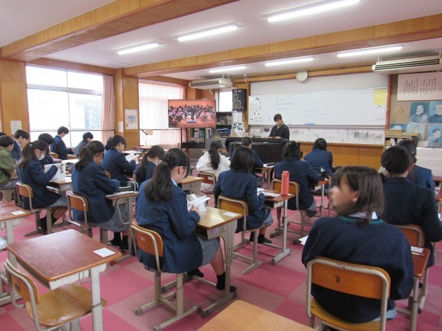 1年2組の音楽科の授業では、オーケストラ入門の事後学習その2として、学習ノートを使って曲の重要な部分を振り返り、続いて定期テストに向けたテスト範囲の確認と復習を行い、そして最後に「3年生を送る会」で演奏する「風になる」の歌唱練習をしました。