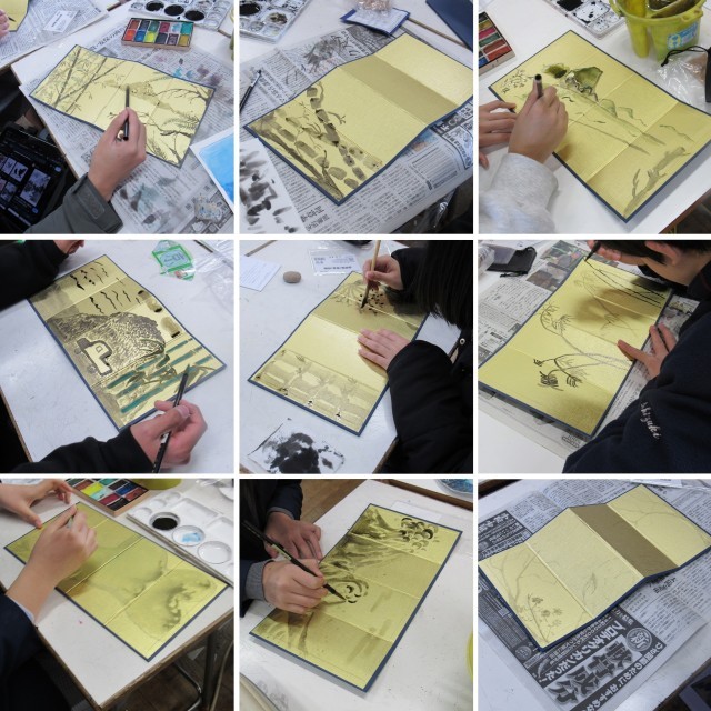 3年3組の美術科の授業では、最後の制作で本歌取りからの屏風を水墨画で仕上げました。