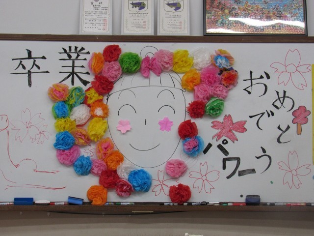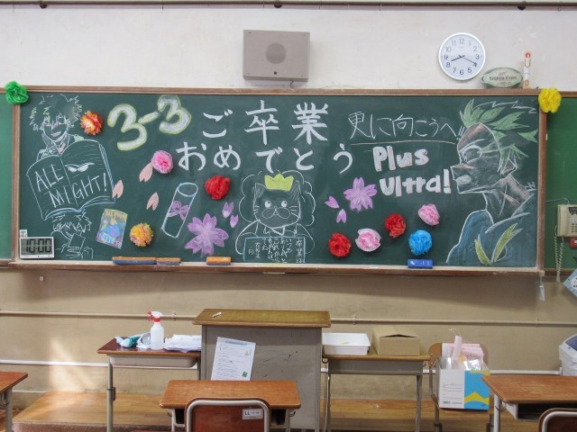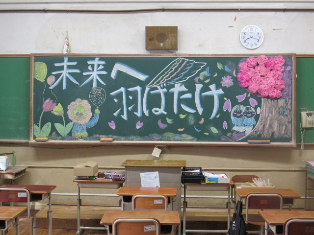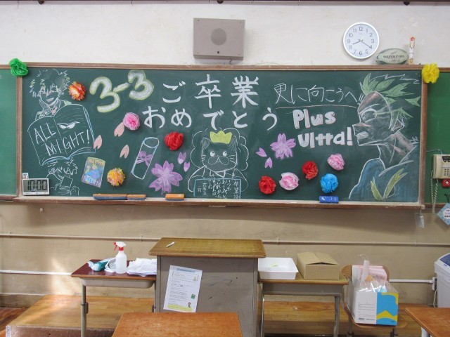 各クラスの黒板には、在校生によるメッセージアートが描かれています。