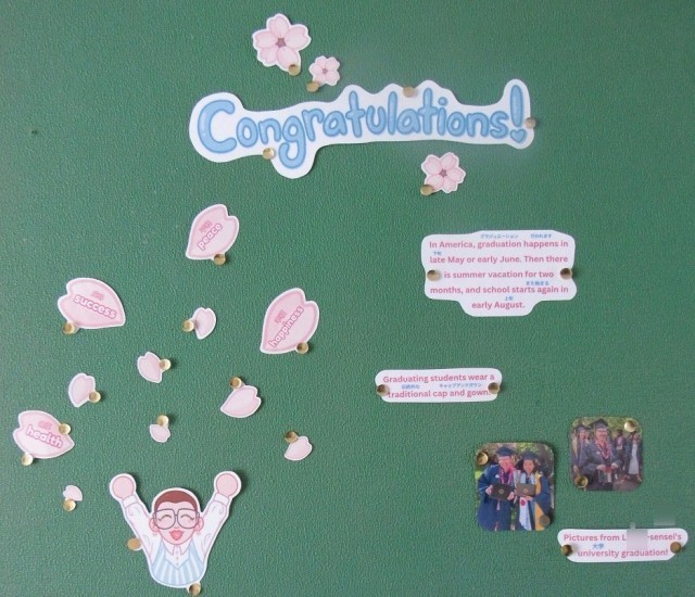 また、生徒会用掲示板の横には、ALTのL先生の英語によるお祝いのメッセージが掲示されています。