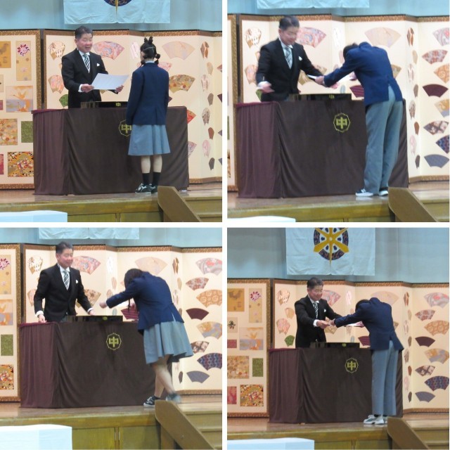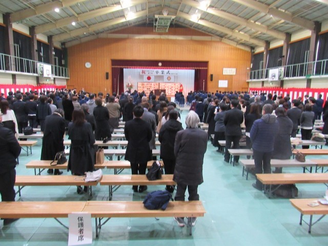 担任の先生の呼名に対し、はっきりした元気な声で生徒がこれに応え、校長先生から卒業証書を授与されました。