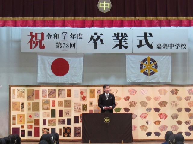 3年間の中学校生活に対する慰労と、ある企業の創始者の言葉を借りて、「利他の心」を持ち続けてほしいとの卒業生への希望が語られました。