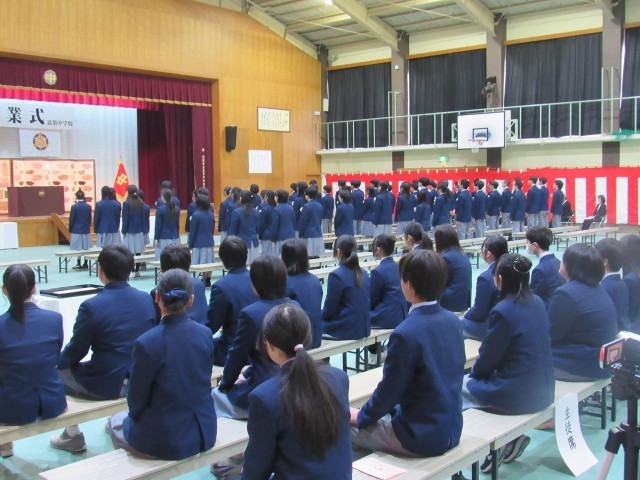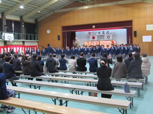 そして最後に、ピアノの前奏が鳴り響き、卒業生による混声三部合唱曲「旅立ちの日に」の合唱、会場全員による「蛍の光」の斉唱で、式を終えました。