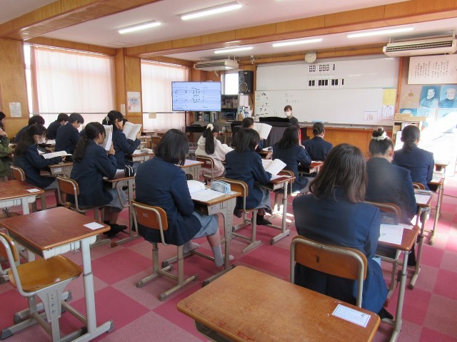 1年2組の音楽科の授業では、「夢の世界を」の解説と歌唱練習、そして8分の6の指揮法の練習をしました。