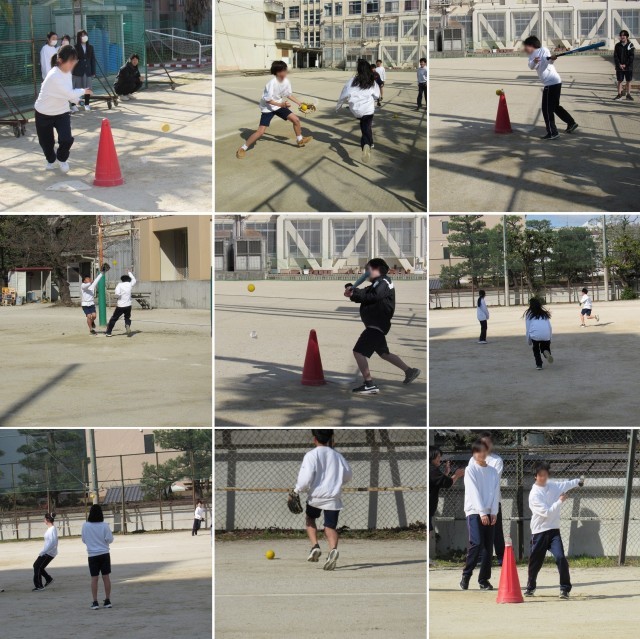 1年4組の保健体育科の授業では、2年3組とソフトボール対決を楽しみました。