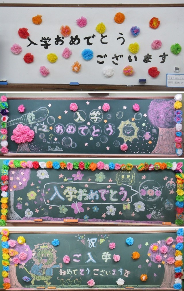 また、各教室では、在校生の手による黒板アートが新入生を歓迎しています。