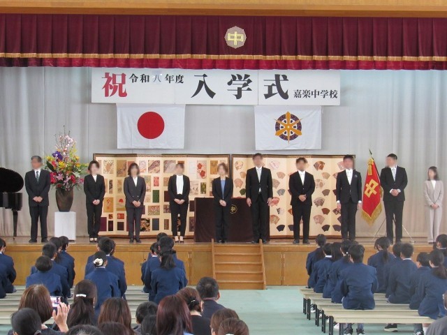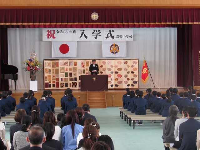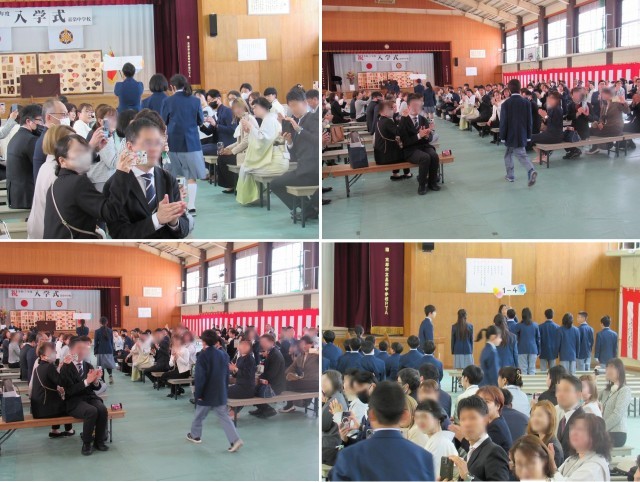 初めに、国歌並びに校歌の斉唱、続いて学校長の式辞として、新入生に対する祝辞、そして学校教育目標の確認と不安定な社会に対し、将来、しなやかで力強く対応できるようにアップデートできる能力を身に着けるため、この3年間で挑戦する15歳になれるよう仲間と支え合って、心身ともに豊かに成長していってほしいとの励ましの言葉がありました。