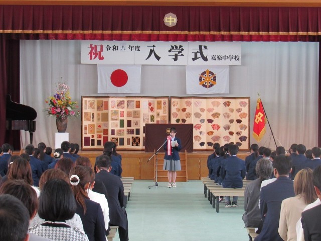その後、在校生代表として生徒会環境美化委員長のYさんが歓迎の言葉として、嘉楽中学校の各種行事とその取り組み姿勢を紹介し、