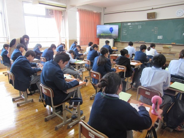 2年3組の英語科の授業では、ALTのT先生の自己紹介に続いて、イラストを見てその内容を伝える練習をしました。