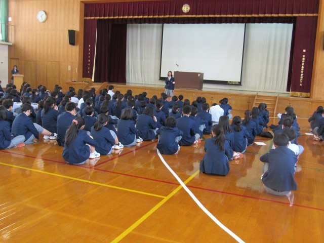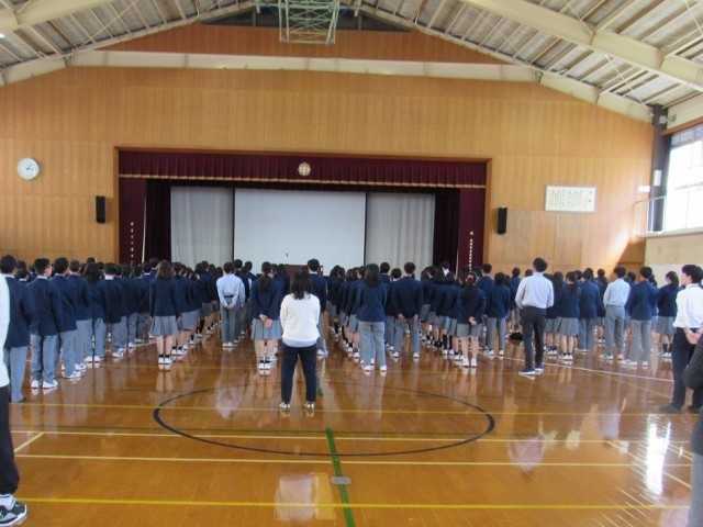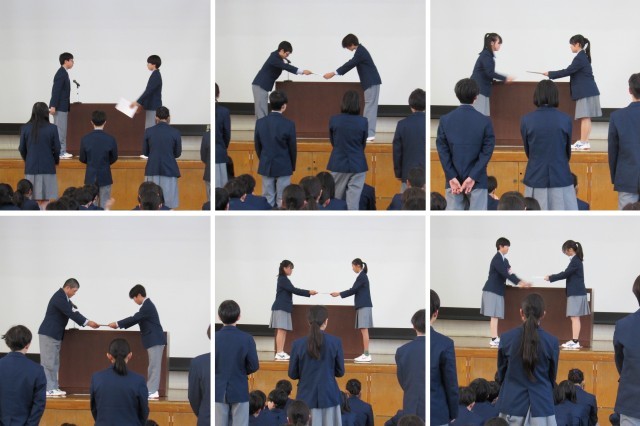 式を始めるに当たって全員で校歌を斉唱し、続いて全員が見守る中、評議員、生活安全委員、環境美化委員、保健体育委員、図書文化委員、学習協力委員の順に、各クラスから選出されたそれぞれの委員のみなさんが起立し、代表者が生徒会本部それぞれの委員長から認証状が手渡され、そのたびに大きな拍手が上がり、温かい雰囲気の中で式が進行し、生徒会長そして学校長の挨拶で式が締めくくられました。