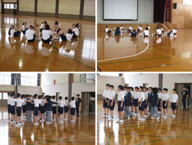 1年4組の保健体育科の授業では、軽く筋力トレーニングで体をほぐした後、集団行動の訓練をしました。