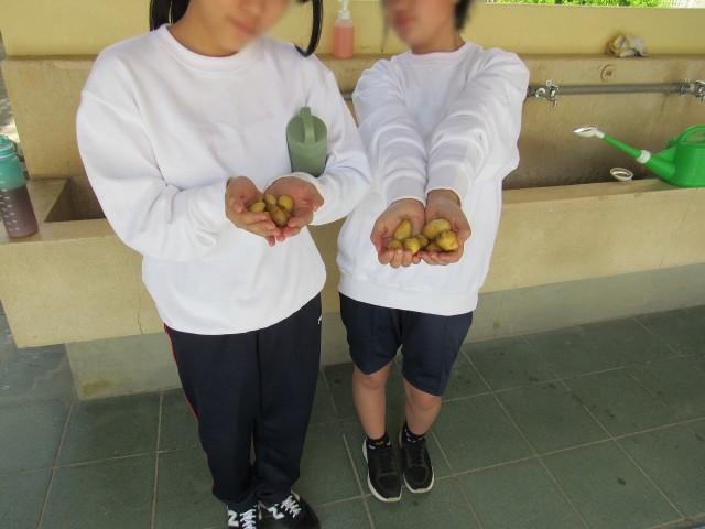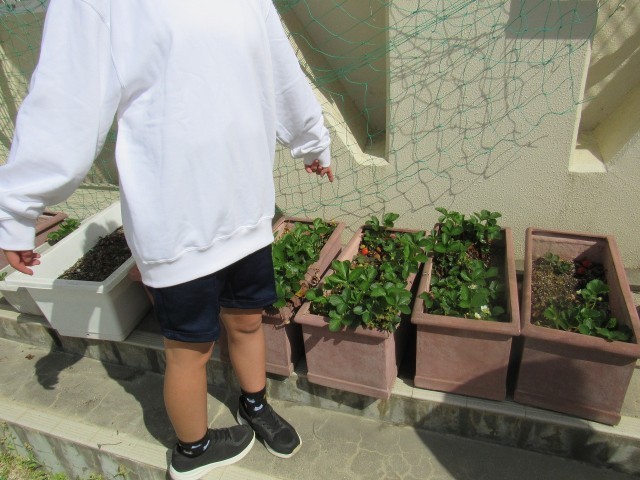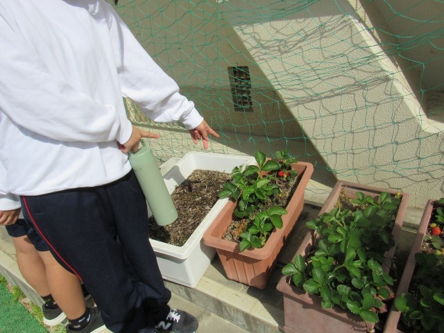 1組の生活科の授業では、作物への水やりや雑草抜きの後、イチゴとジャガイモの収穫をしました。