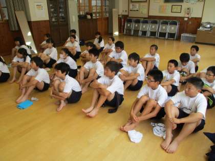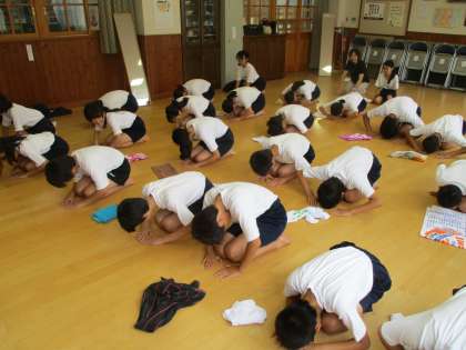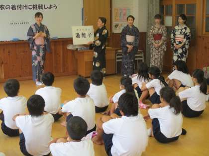 初めに和服、特に浴衣についての説明、その後、きちんと礼をして着付けの練習開始です。