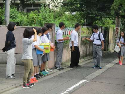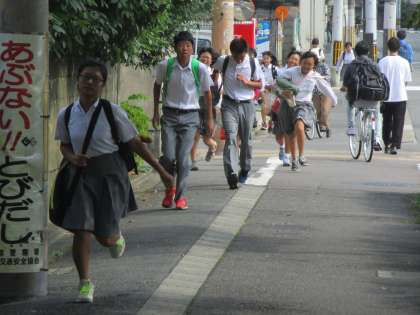 「急ぎなさーい!」の言葉に登校中の人たちが一斉に走り出しました。