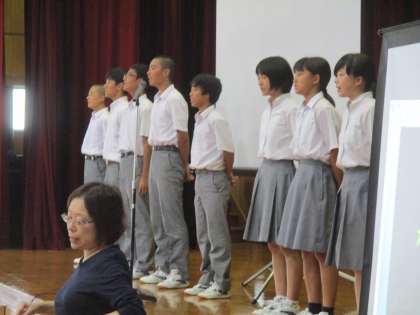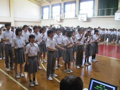 まずは全校で校歌を歌います。伴奏は吹奏楽部です。いつもありがとう。