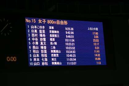 写真は男子50メートル自由形と、女子800メートル自由形のレースの様子です。