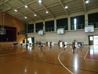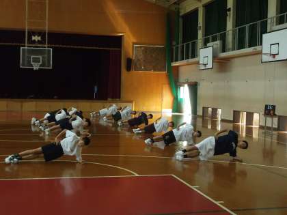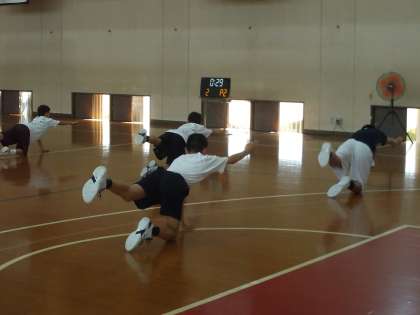 講堂では,男子バスケット部が練習をしています。競技力の向上も重要ですが,基礎的な体力や体幹を鍛える練習も頑張っています。