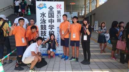 水泳の全国大会へ出場した選手と顧問の先生から写真が届きました。