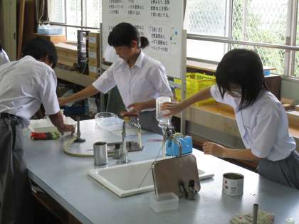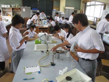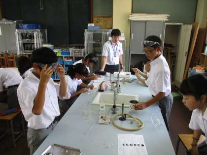 こちらは理科の時間です。目を守るためゴーグルを着用しての実験です。