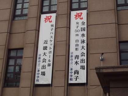 夏の大会で,近畿大会,全国大会に出場した個人と団体の栄誉をたたえ,懸垂幕を設置しました。これは,本校のPTAのご支援によるものです。