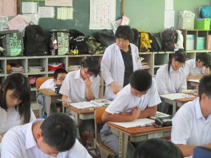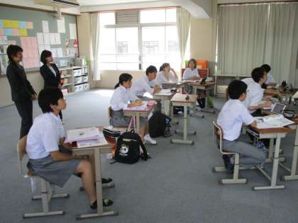 5組の社会科の授業は、高槻市の学校から参観に来られています。学校に難聴の生徒が入学してきて、その子に対する支援を研究されているところだそうです。