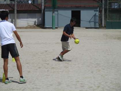 男子はハンドボールです。練習の仕方について、教育実習生と福井先生が見本を見せています。