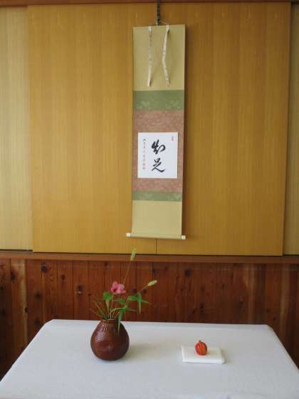 お軸は山科瑞光院 前田宗源師 の「知足(足るを知る)」、梅津川籠花入れに二条中の槿花(ムクゲ)、エノコロ草、吾亦紅(ワレモコウ)の3種を入れ、北村雅耕作 紙彫りの石榴(ざくろ)の香合を荘りました。お菓子は亀広脇で主菓子は女郎花、お干菓子は稲穂の落雁でした。