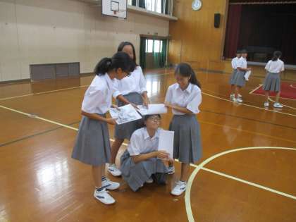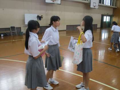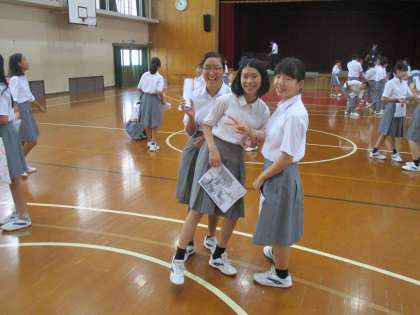 2年生が3階の講堂に集まっていました。「合同劇」に携わっている人たちです。