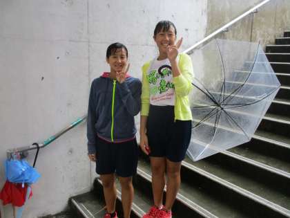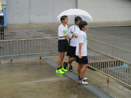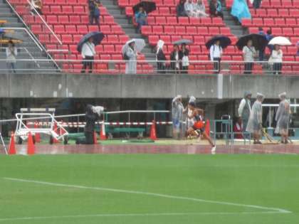 激しい雨の中のレース、走る人も応援の人も大変です。