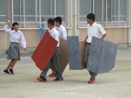 道具係の人は、用意が大変です。5組の人たちは太鼓を運びます。