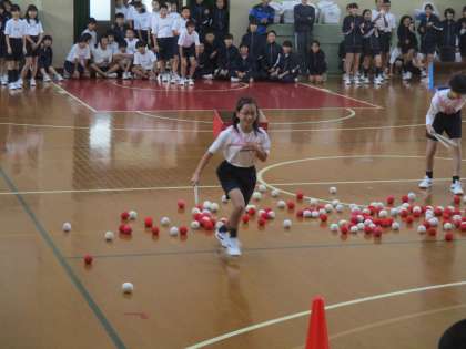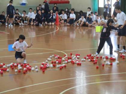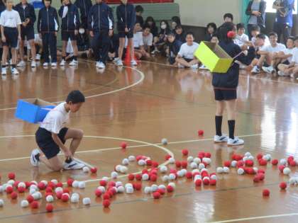 クリーン大作戦でしたっけ。とにかく、ごみに見立てた紅白球を2つ拾って背中に負った籠に2つずつ入れてリレーするというものです。