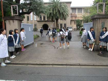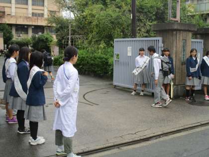 さて、今日も元気に生徒たちが登校してきました。校門で待つのは生徒会役員に立候補した人たちです。