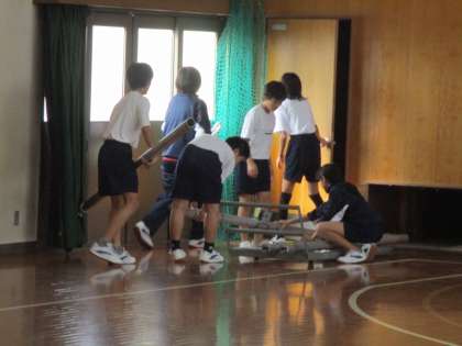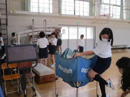 体育館ではマット運動です。観に行ったときにはちょうど後片付けの最中でした。