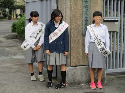 また、校門では生徒会役員宣教に立候補している人たちが、元気な声で迎えています。