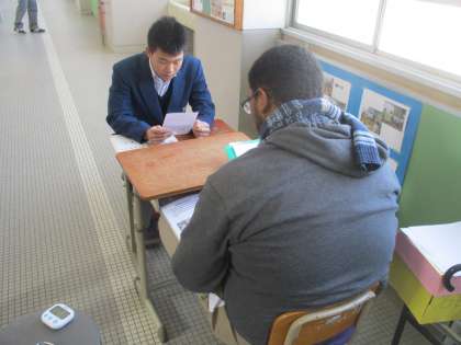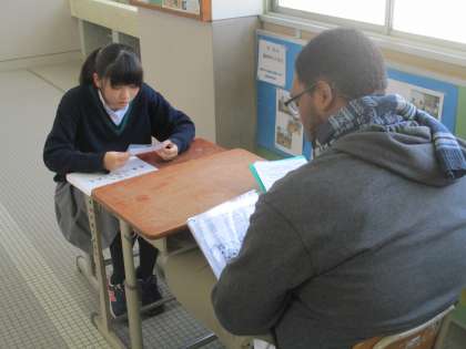 1組は英語。渡されたカードの絵や文章についてALTのジョシュ先生が英語で質問をします。それに対して英語で答えます。これはよい学習です。